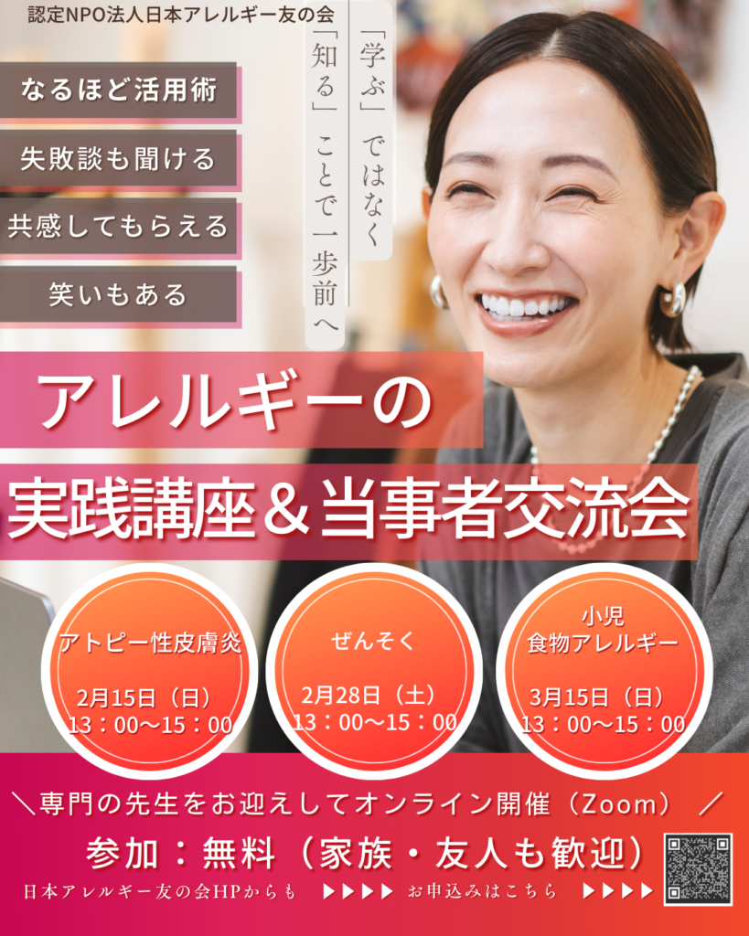 日々のケアやアレルギー対応などアレルギー患者として疾患にどのようにして向き合っていけば良いか、実践的に学ぶ機会です。お気軽にお申し込み下さい。
